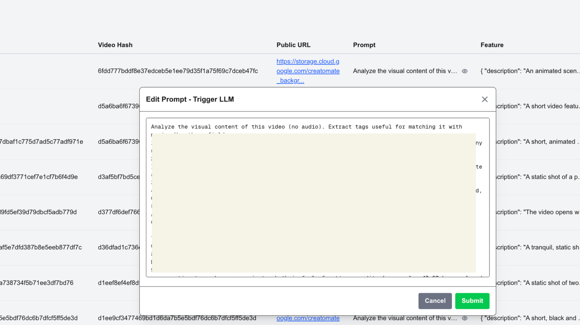 例如我先開發 “新增 Video Feature” 功能,本質上跟新增 todo差不多,只不過輸入的是影片uid,以及支持 “調用 LLM 大模型”分析影片的按鈕。這裡 LLM 大模型則延用 Google 提供的 Vertex AI 能力,初版大約花一小時就開發完成。